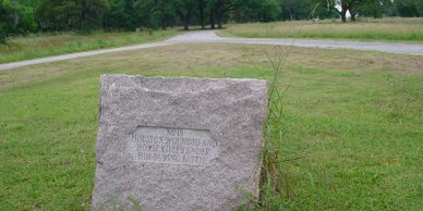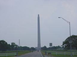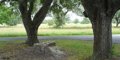 During the battle, Houston's ankle was shattered by a musket ball at this location. Beneath the trees in the distance were the Mexican army's cannon and breastworks.