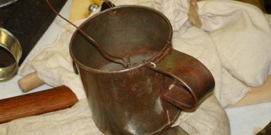 A tin cup would be a common item that the soldados would carry in a haversack when they traveled from place to place. Hannah and Jackie used a cup like this one to prepare coffee.